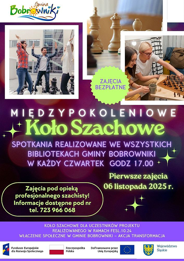 Wspólnie z Bibliotekami Publicznymi Gminy Bobrowniki tworzymy przestrzeń do regularnych spotkań i treningów szachowych pod okiem instruktora. Zajęcia skierowane są do wszystkich – bez względu na wiek i doświadczenie. Zajęcia będą realizowane od listopada w każdy czwartek o godz. 17.00. Planujemy realizować je w przestrzeni każdej Biblioteki Publicznej. Zwracamy się z uprzejmą prośbą o wsparcie w propagowaniu tej inicjatywy wśród uczniów, nauczycieli oraz rodziców, a także o zachęcenie do udziału w nadchodzącym wydarzeniu, zgłoszeniu drużyn reprezentujących Waszą społeczność. Liczymy na Państwa życzliwość i współpracę w popularyzowaniu spędzania wolnego czasu przy szachownicy.