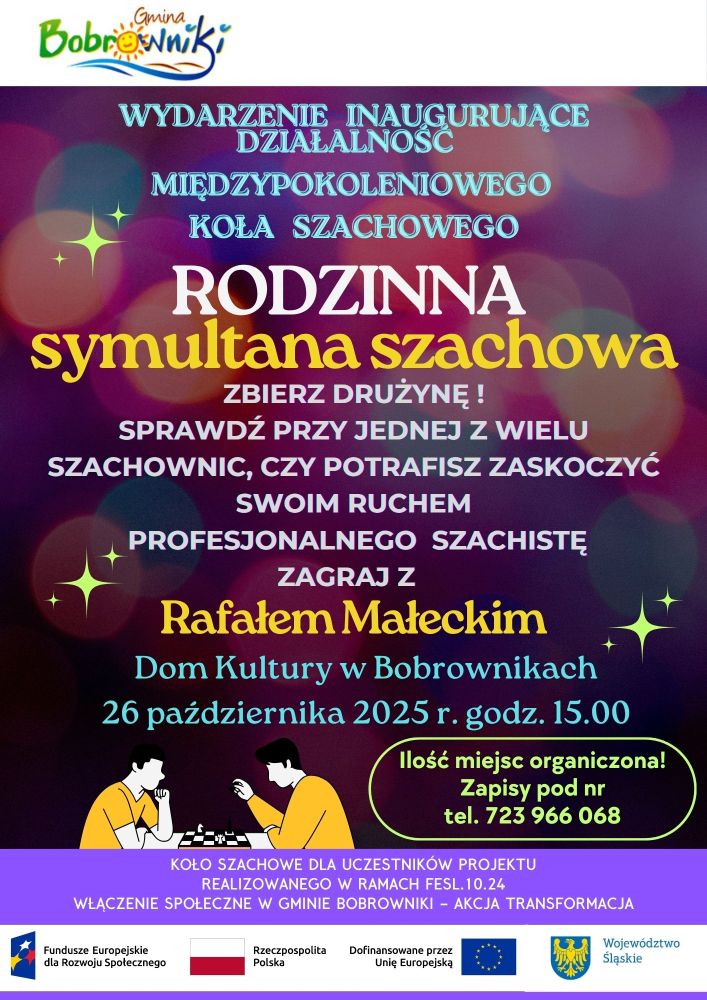 To otwarte, bezpłatne wydarzenie, podczas którego uczestnicy będą mogli rozpocząć przygodę lub sprawdzić swoje umiejętności i zmierzyć się z profesjonalnym szachistą – Rafałem Małeckim – w przyjaznej, rodzinnej atmosferze. Uczestnictwo w wydarzeniu wymaga zgłoszenia.