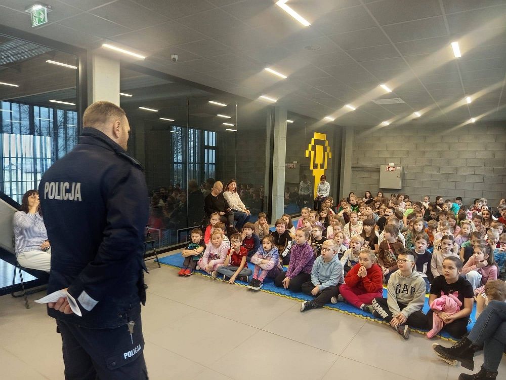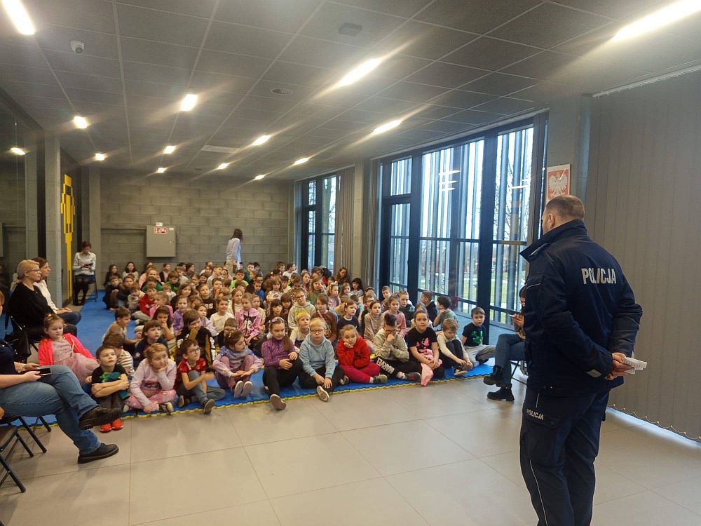Spotkanie z panem asp. szt. Piotrem Sikorą policjantem z Komisariatu Policji w Wojkowicach było skierowane do uczniów klas I–IV. Tematem rozmowy było bezpieczne spędzanie ferii zimowych. Policjant w przystępny i ciekawy sposób opowiadał dzieciom, jak dbać o swoje bezpieczeństwo w czasie zimowego wypoczynku. Przypomniał uczniom zasady bezpiecznej zabawy na śniegu i lodzie, zwracając szczególną uwagę na zakaz wchodzenia na zamarznięte zbiorniki wodne. Omówił również, jak bezpiecznie jeździć na sankach, nartach i łyżwach oraz jak zachować się w pobliżu drogi. Dzieci dowiedziały się także, jak postępować w kontaktach z nieznajomymi oraz do kogo zwrócić się o pomoc w sytuacji zagrożenia.