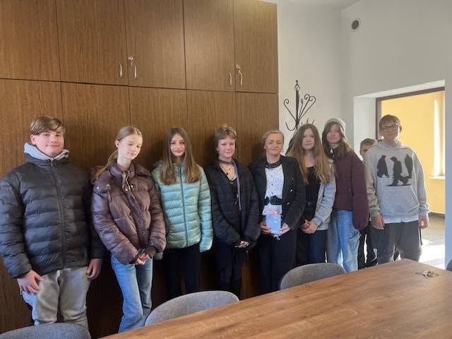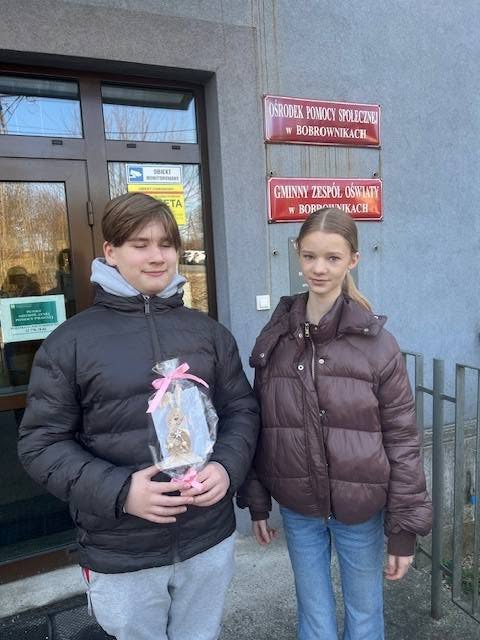 Wolontariusze pamiętali również o świątecznych życzeniach dla ważnych osób związanych ze szkołą i gminą. Złożyli serdeczne życzenia pani dyrektor Anecie Kocot oraz pani wicedyrektor Jolancie Karcz. Odwiedzili także dyrektor oświaty w gminie Bobrowniki, panią Anetę Rogalę, a także przekazali życzenia pani wójt gminy Bobrowniki, Małgorzacie Bednarek. Do składanych życzeń przyłączył się również Samorząd Szkolny.