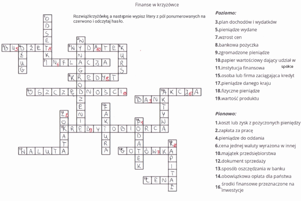 W ramach konkursu Bądź Aktywny z Kuratorem uczennice klasy 8 opracowały krzyżówkę, realizując zadanie konkursowe: Uczniowie ogarniają ekonomię. W pracy wykorzystały pojęcia z zakresu ekonomii, finansów oraz przedsiębiorczości, samodzielnie dobierając hasła oraz formułując ich definicje. Hasło główne stanowi podsumowanie zdobytej wiedzy i nawiązuje do zasad racjonalnego gospodarowania pieniędzmi. Realizacja zadania sprzyjała rozwijaniu umiejętności logicznego myślenia, selekcji informacji oraz efektywnej współpracy. Opracowana krzyżówka może stanowić atrakcyjny materiał dydaktyczny służący utrwalaniu podstawowych pojęć ekonomicznych.